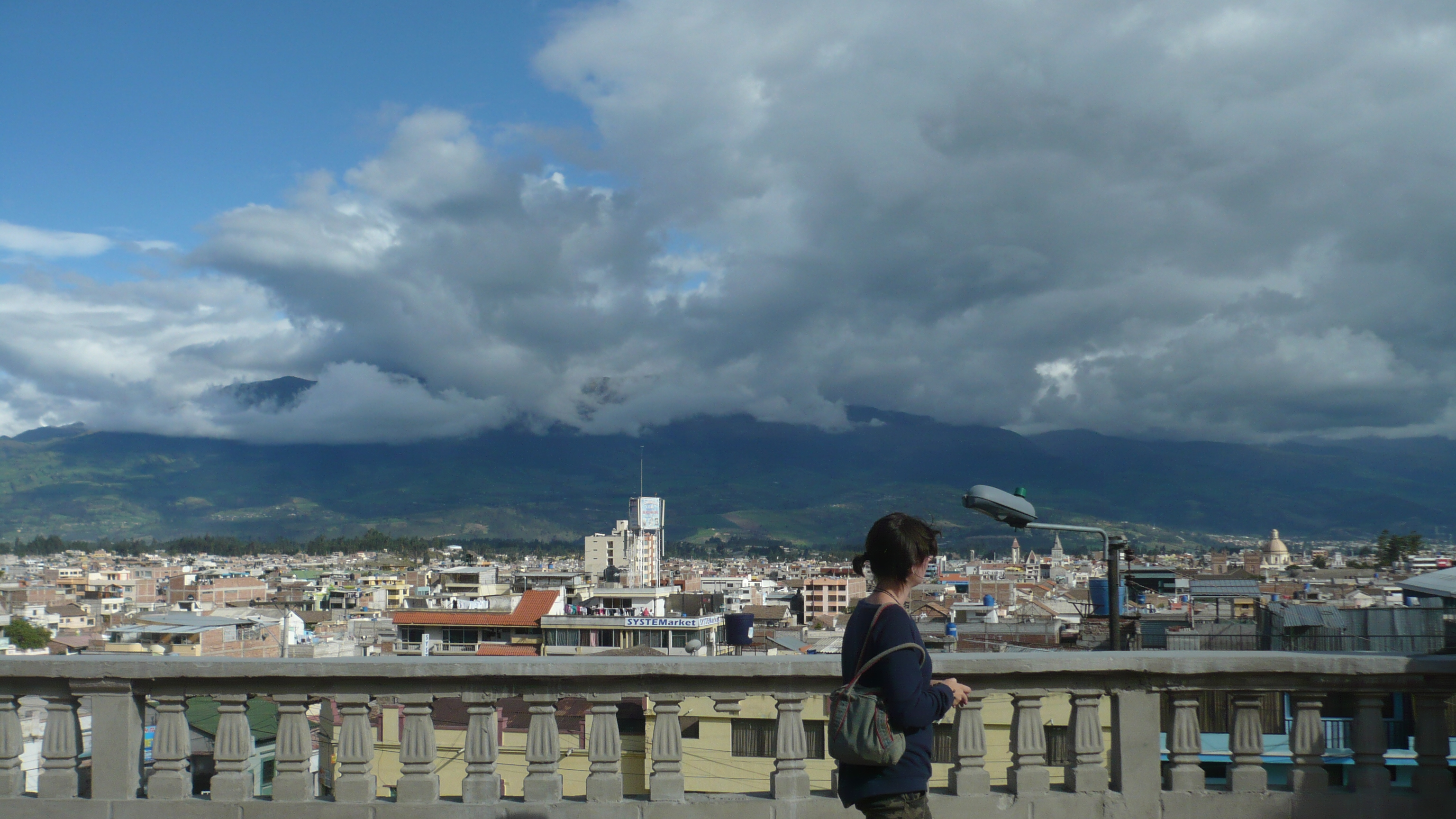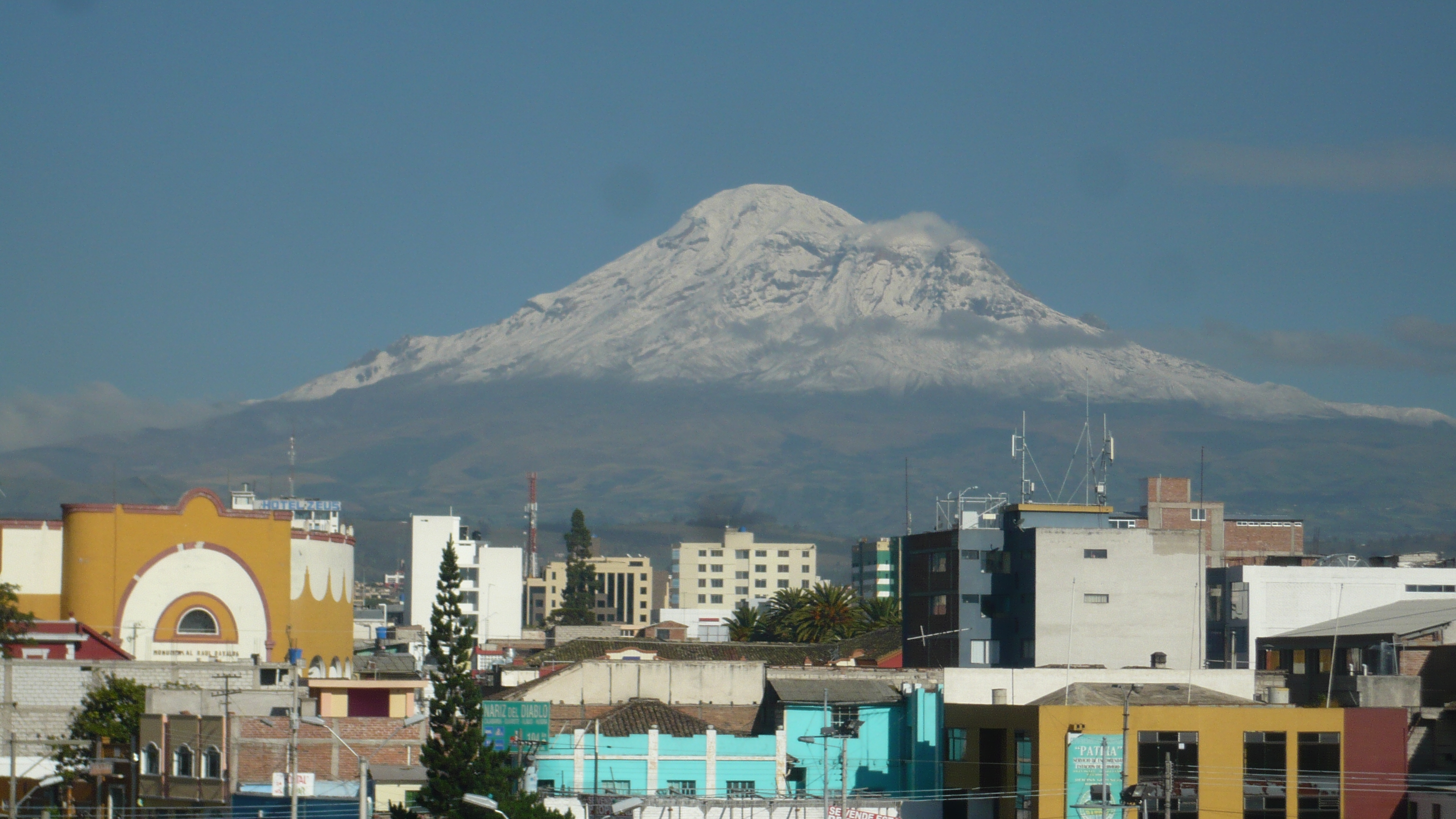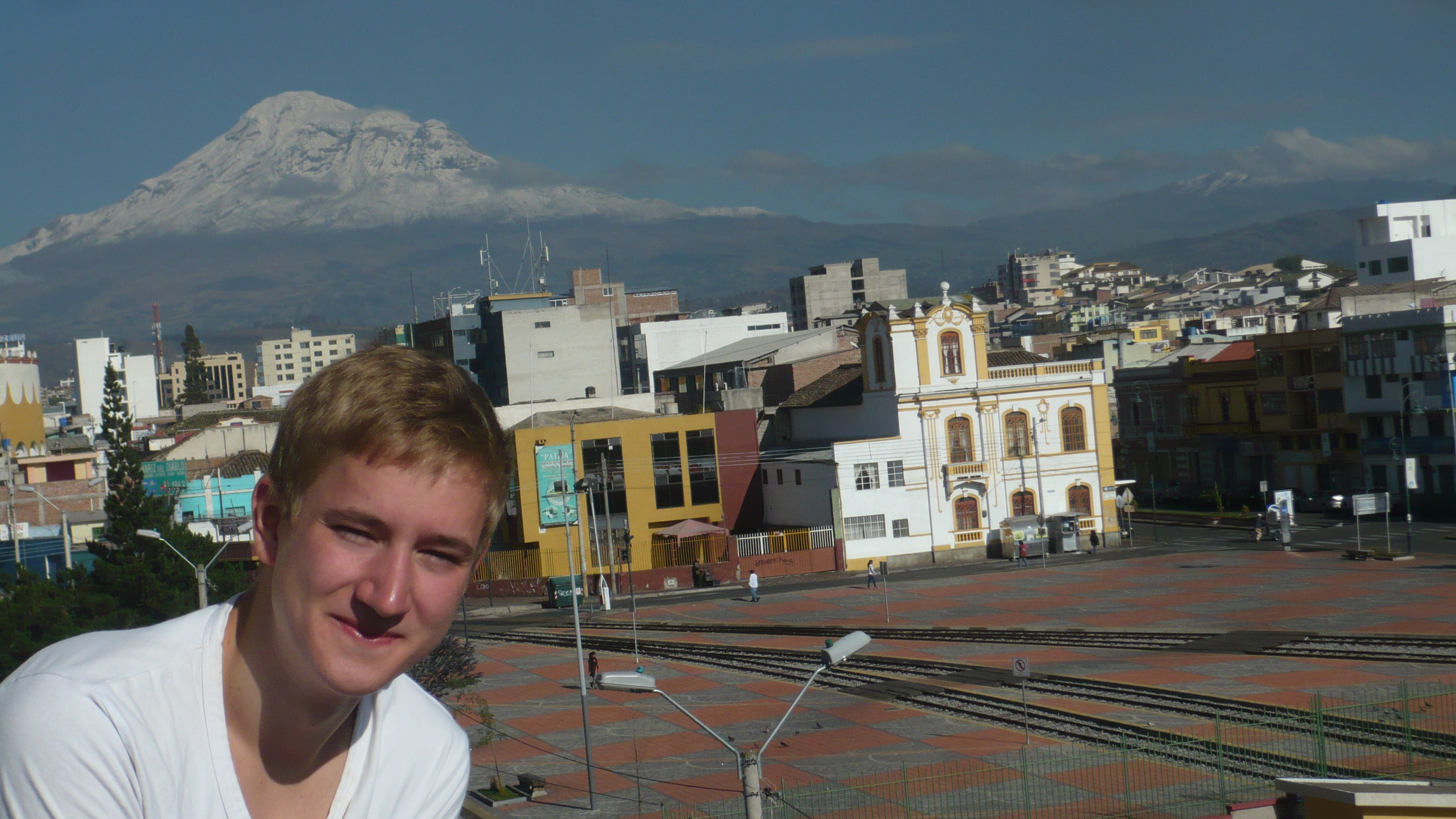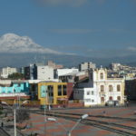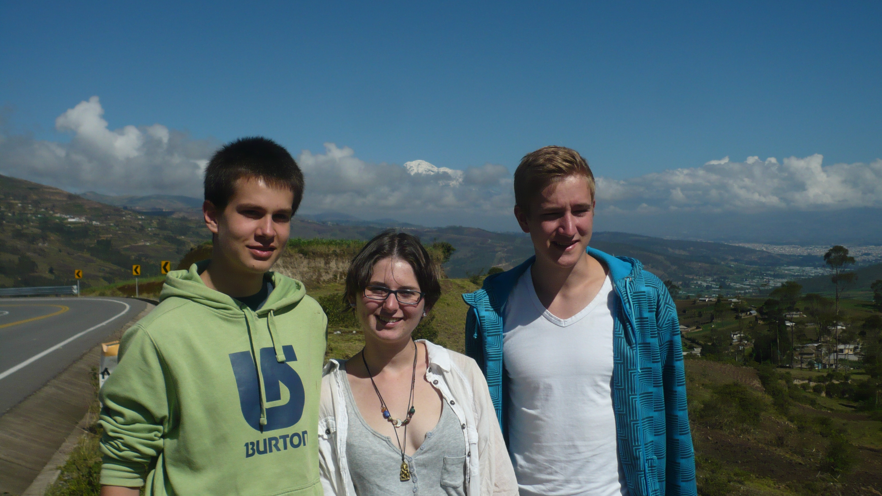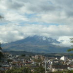 Weil es heute wieder weiter gehen sollte, waren wir zum Glück schon wach, als die Hoteleigentümerin mit einem euphorischen. „chicos“ an unserer Zimmertür klopfte. Eilig führte sie uns auf die Dachterrasse, von der man einen traumhaften Blick auf den, heute erstmals ohne Wolken zu sehenden, Chimborazo hatte. Eine wahrhaftig beeindruckende Sicht auf dieses Monstrum der Natur. Unsere Hotelgasgeberin bestand auf einen ausführlichen Fotoshoot in verschiedensten Posen und Konstellationen: „Me gusta la fotographía y hice und curso de la fotographía.“