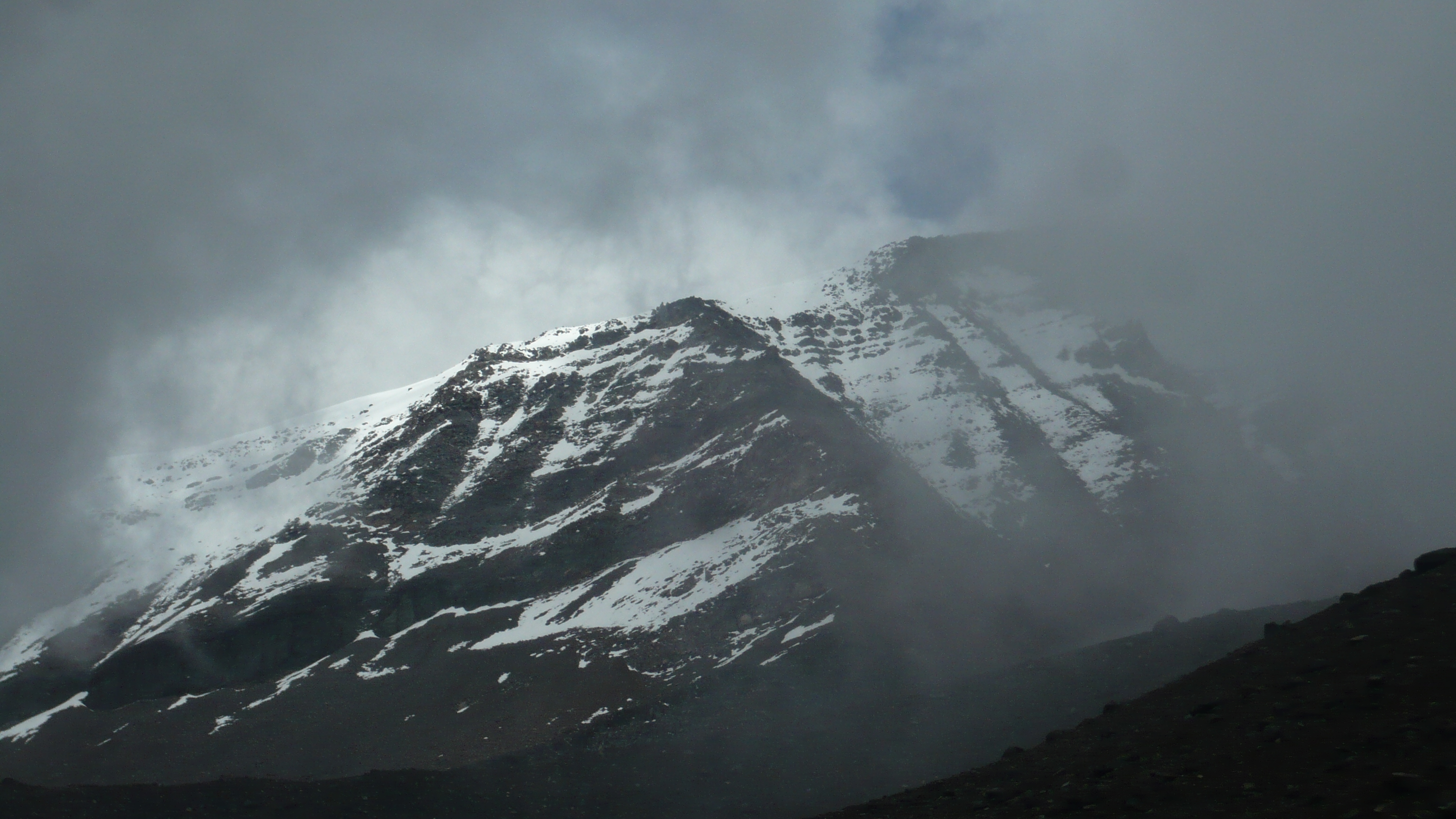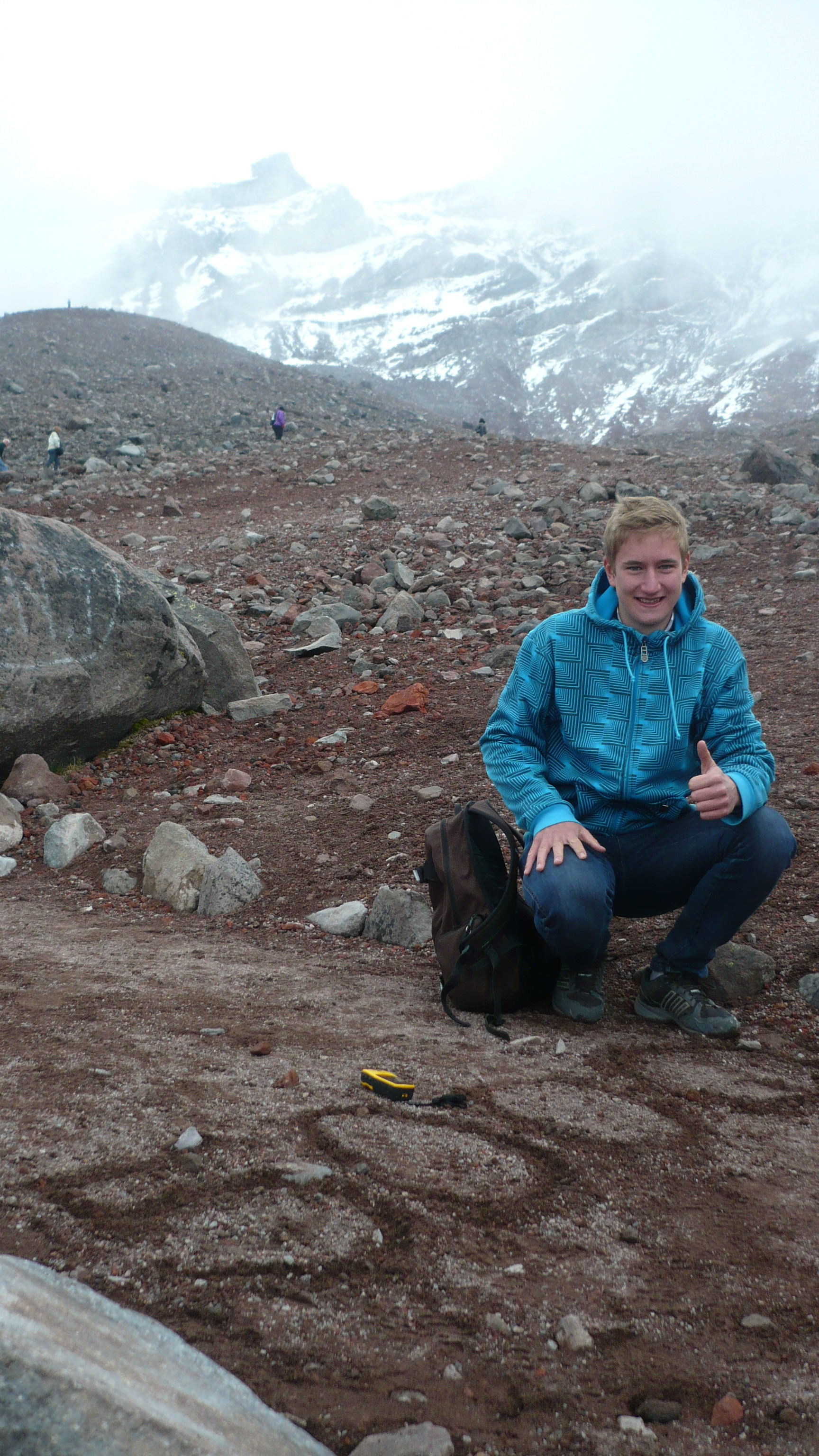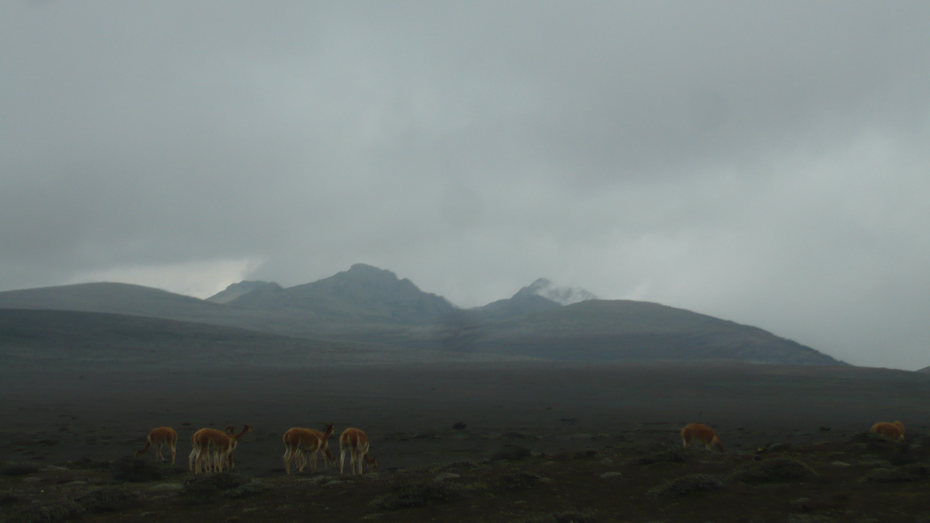 Weil es heute wieder weiter gehen sollte, waren wir zum Glück schon wach, als die Hoteleigentümerin mit einem euphorischen. „chicos“ an unserer Zimmertür klopfte. Eilig führte sie uns auf die Dachterrasse, von der man einen traumhaften Blick auf den, heute erstmals ohne Wolken zu sehenden, Chimborazo hatte. Eine wahrhaftig beeindruckende Sicht auf dieses Monstrum der Natur. Unsere Hotelgasgeberin bestand auf einen ausführlichen Fotoshoot in verschiedensten Posen und Konstellationen: „Me gusta la fotographía y hice und curso de la fotographía.“