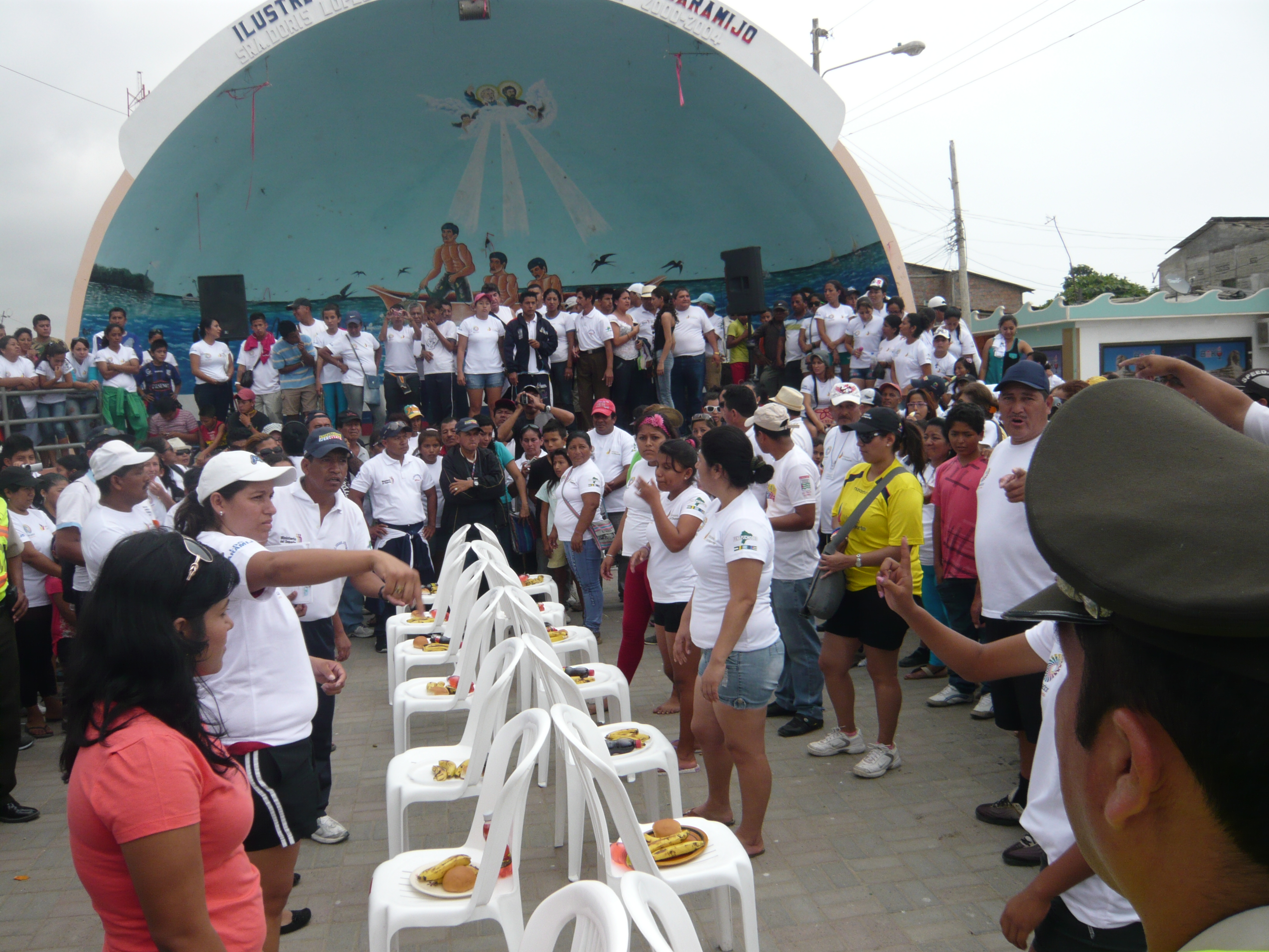 Die „Foundation Pueblo Cholo de Ecuador“ lud zum großen Treffen von 5 Provinzen nach Manta ein. Das Kultusministerium bezahlte Busfahrt, Hotel und Verpflegung. Kein Wunder, dass die Provinz Guayas gleich mit zwei Reisebussen anrückte. So auch die Gastfamilie von Insa und natürlich meine, da Papa Chacha Präsident des Pueblo Cholo Guayas ist. Meines Wissens sollen die Traditionen des indigenen Volkes Cholo durch den Verein erhalten werden. Chacha erzählte mir im Vorhinein, dass das ganze Wochenende aus Sportfestspielen bestehen sollte, aber nicht alle mitmachen, wir daher nur zuschauen. Neben „Reise nach Jerusalem“, Wettessen, Bier-Wetttrinken, Eierlaufen und Sackhüpfen wurde dann tatsächlich auch wettgerudert, Fußball und Volleyball gespielt und ein Wettbewerb, wobei man ein öliges Zuckerrohr hinaufklettern muss, ausgetragen. Das war an sich ja alles ganz schön anzuschauen, nur muss man in Ecuador ja bekanntlich auf alles und jeden warten (ja, sogar ich! ). Der Bus fährt eine Stunde später los und das Spiel beginnt zwei Stunden später. Langeweile war da leider vorprogrammiert.
